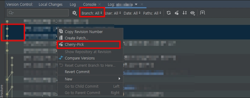 작업할 브런치에서 Git > Show History 중 원하는 항목을 선택한 뒤 우클릭 > Cherry-Pick 하면 해당 작업만 가져올 수 있습니다.