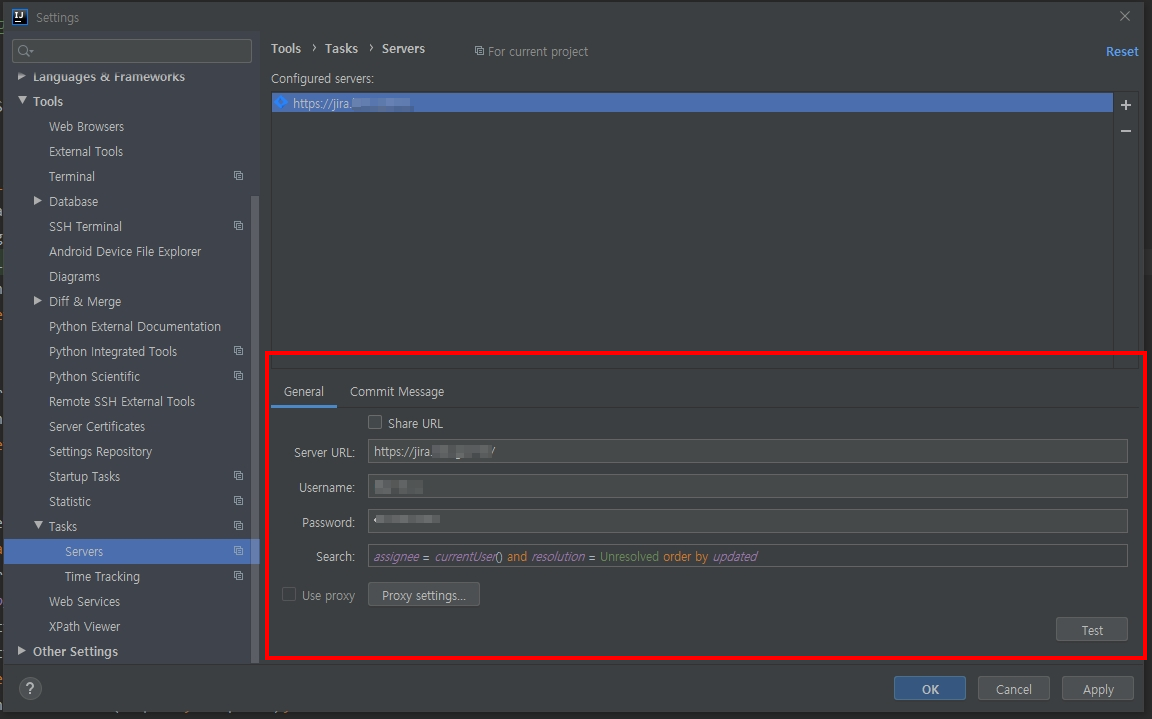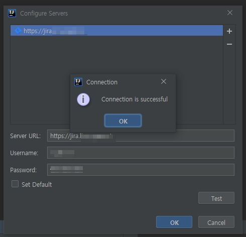 설정 창에서 본인이 사용하는 JIRA URL과 계정 정보를 입력한 뒤 [Test] 버튼을 클릭합니다.