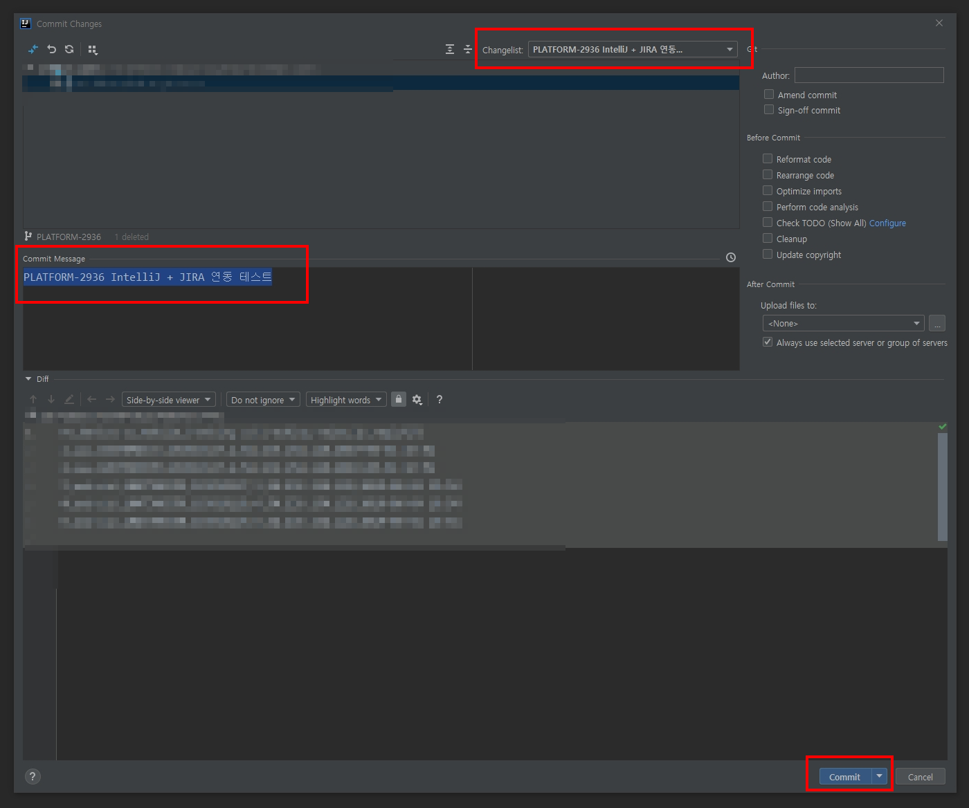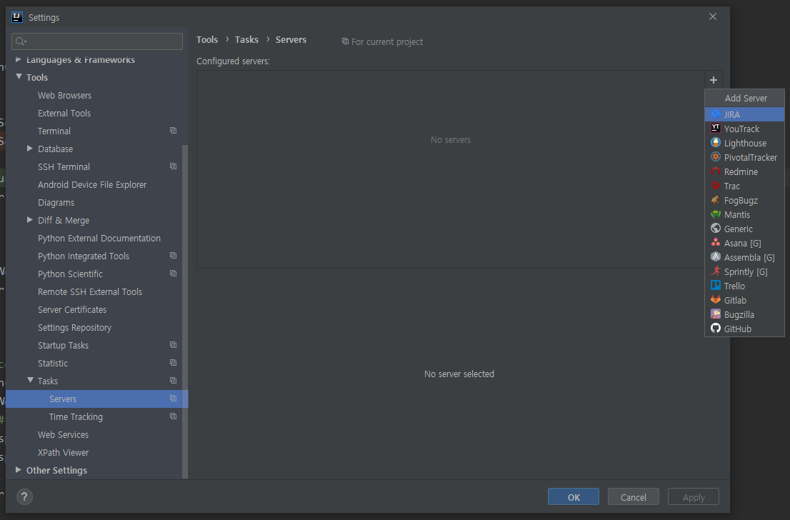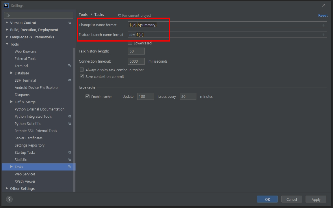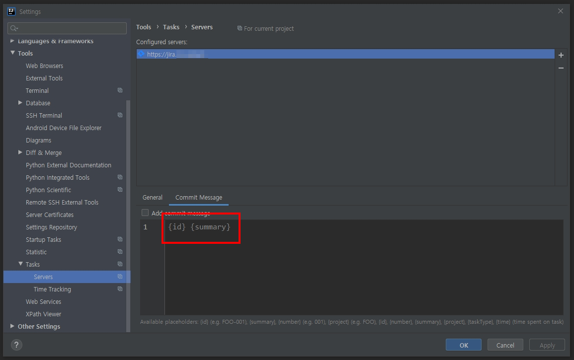 기본 옵션 값으로는 [JIRA번호 JIRA제목] 인데, 해당 값은 File > Settings... > Tools > Tasks > Servers에서 변경 가능합니다.
