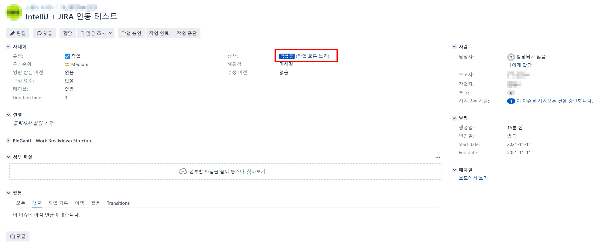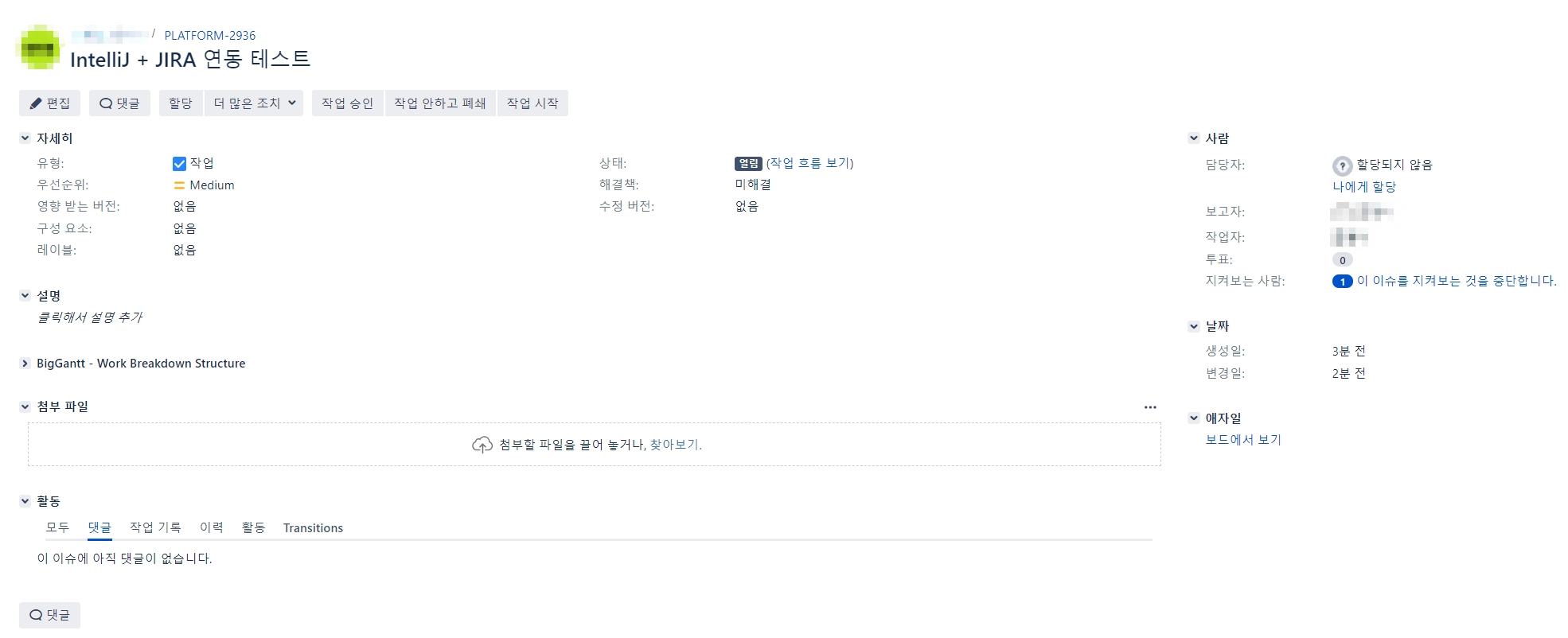 이제 기능을 확인해보겠습니다. 연동할 JIRA task를 생성합니다.
