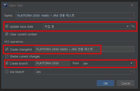 [OK] 버튼을 클릭하면, 해당 JIRA 번호로 브런치가 생성되고 JIRA 상태도 작업 중으로 변경됩니다.