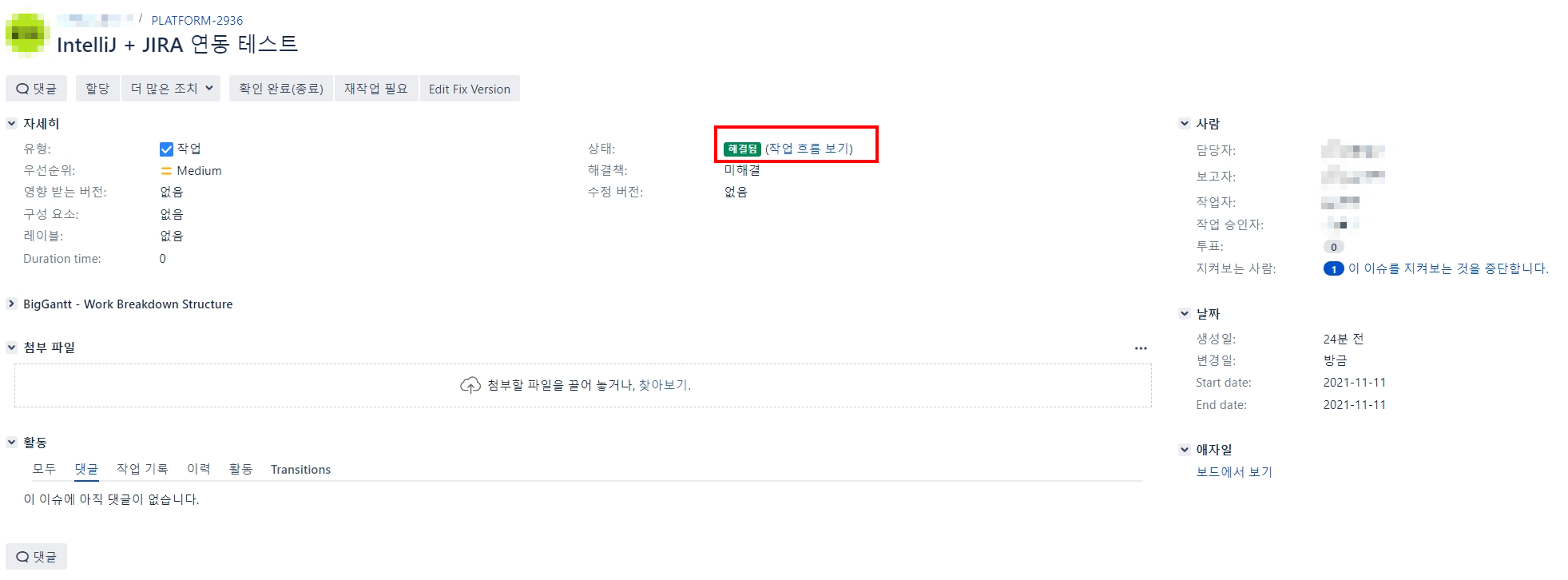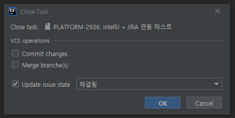 [Alt + Shift + W] 단축키를 사용하여 Close Task 창을 띄워 이슈 상태를 [해결됨 (Resolve)]으로 변경합니다.