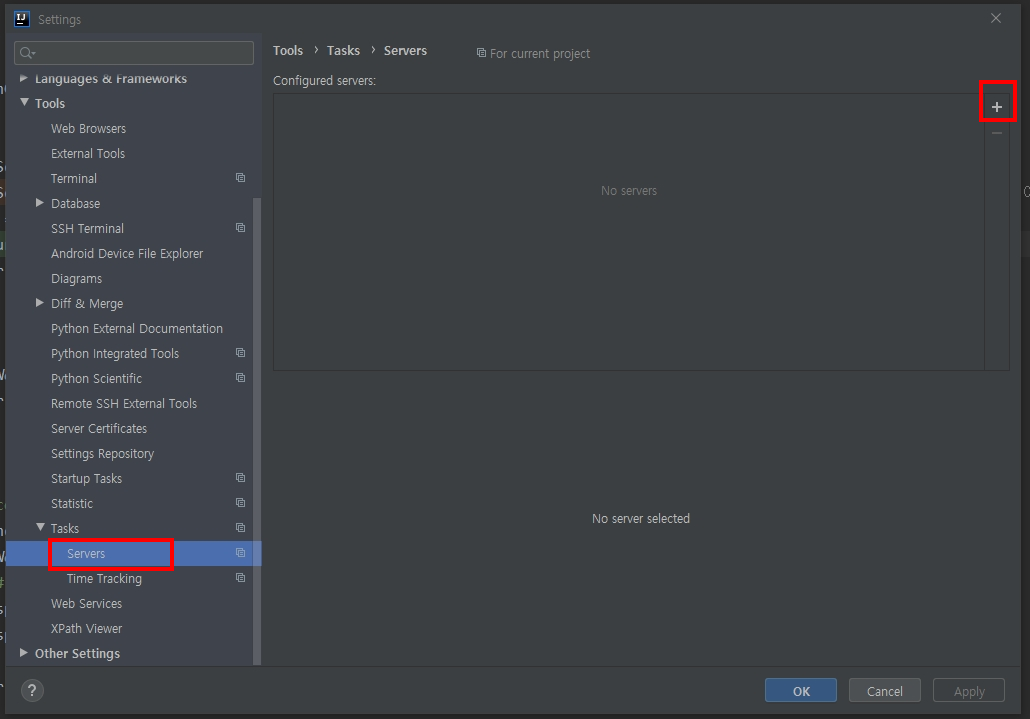 File > Settings... > Tools > Tasks > Servers 경로로 이동합니다.