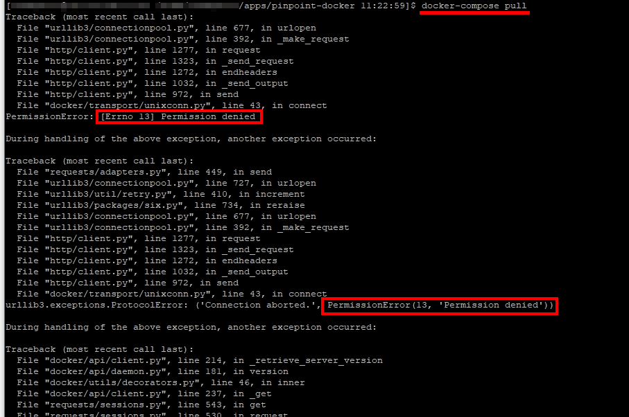 서버에서 유저 권한으로 docker-compose pull와 docker-compose up -d 명령문 실행 시 PermissionError: [Errno 13] Permission denied 오류가 발생했습니다.