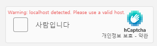 만약 아래와 같이 Warning: localhost detected. Please use a valid host. 란 오류가 발생한다면 hCaptcha가 localhost와 127.0.0.1을 지원하지 않기 때문입니다. https://docs.hcaptcha.com/#local-development