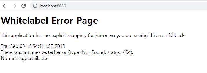 크롬 브라우저에서 http://localhost:8080/ 으로 접속하면 아래와같은 에러 페이지가 뜬다.