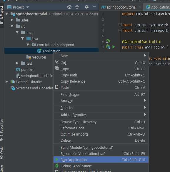 아래와 같이 Application.java 우클릭하여 Run 'Application'을 클릭한다.