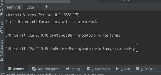 프로젝트 밑에 target에서 maven 명령어를 쳐서 패키징을 하면 빌드 및 패키지가 자동적으로 실행된다.