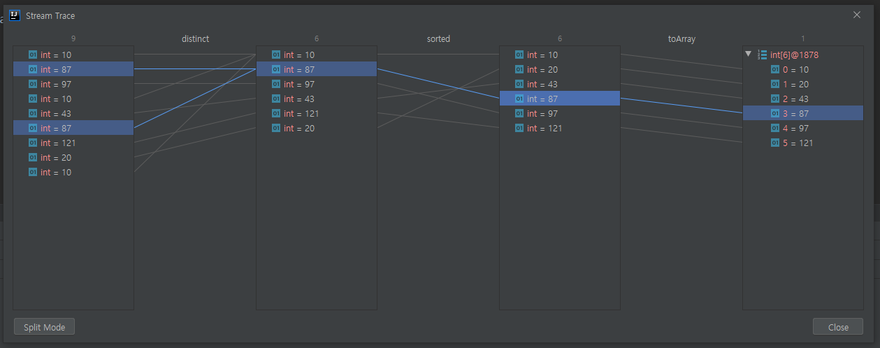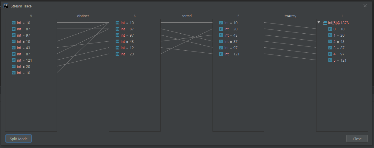 3. 스트림 연산이 수행되고 데이터 변화와 결과를 한눈에 확인할 수 있습니다.