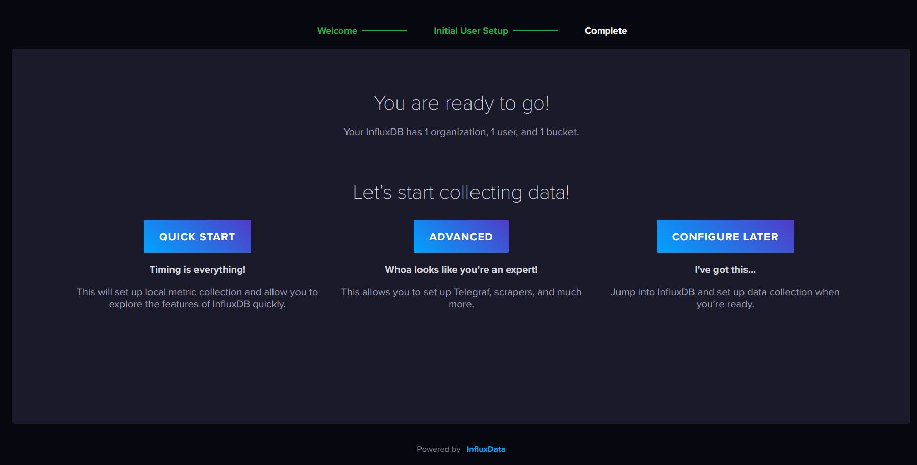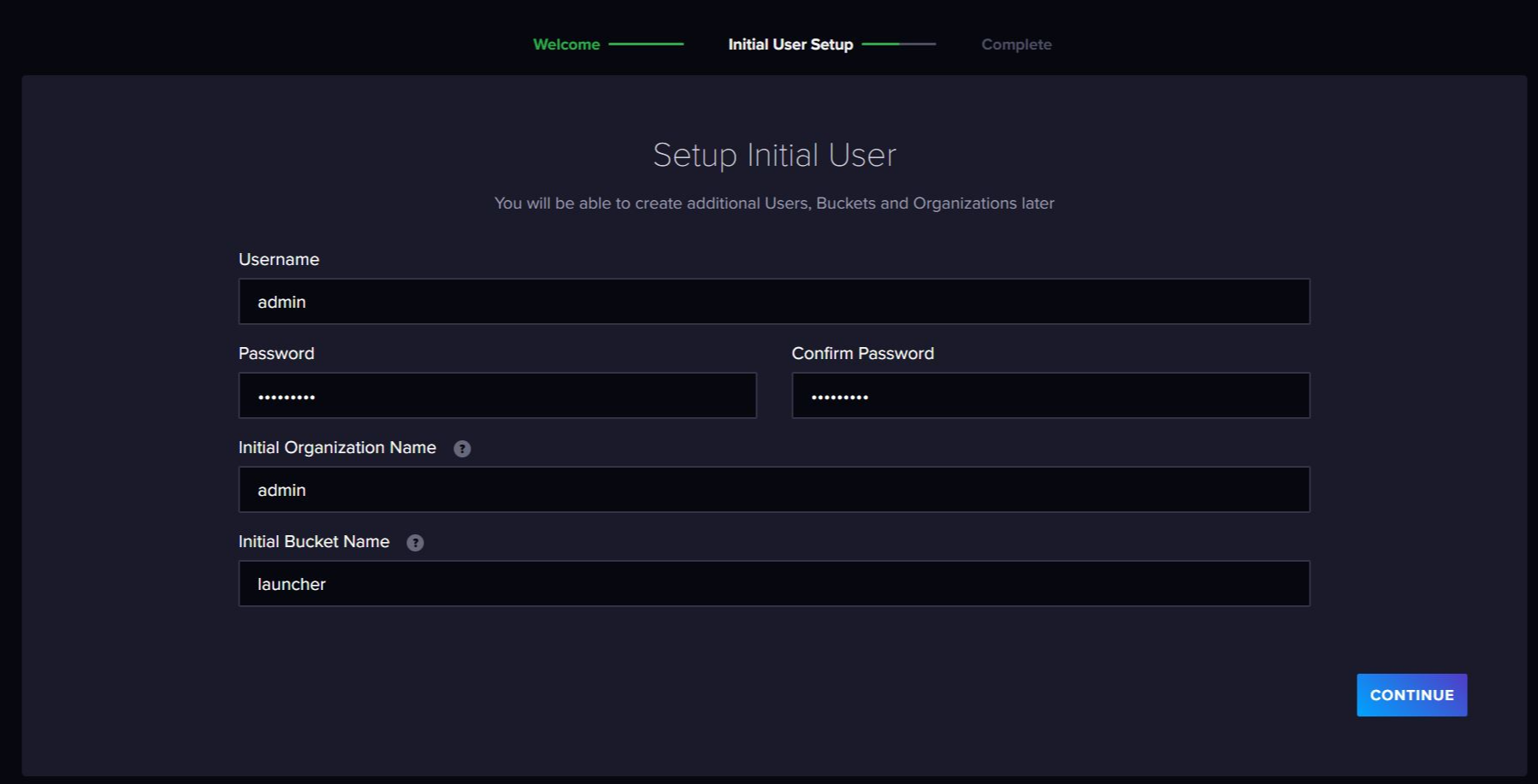 로그인에 사용할 Username(ID)와 Password를 설정합니다. 그리고 Organization과 Bucket 이름을 설정합니다.