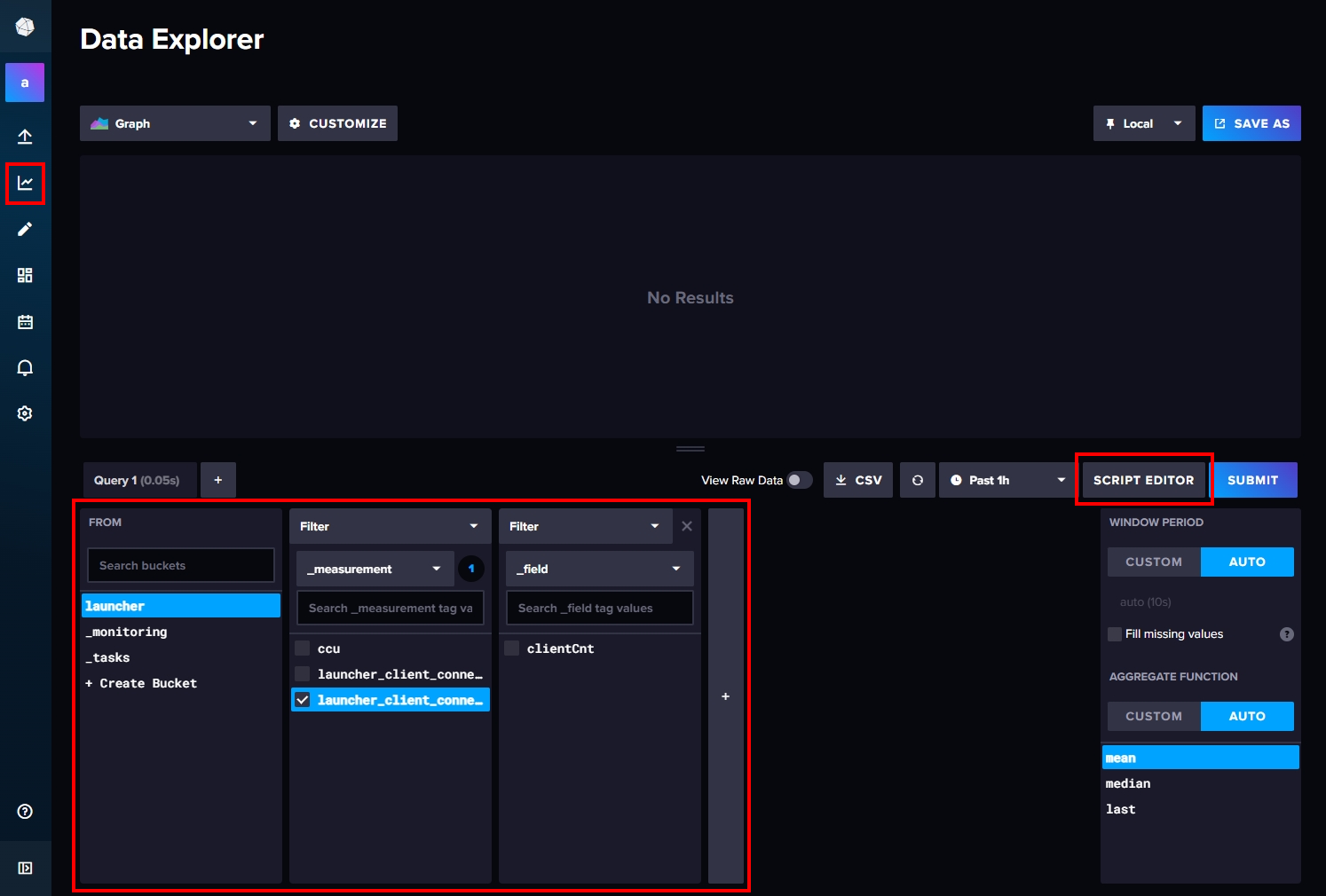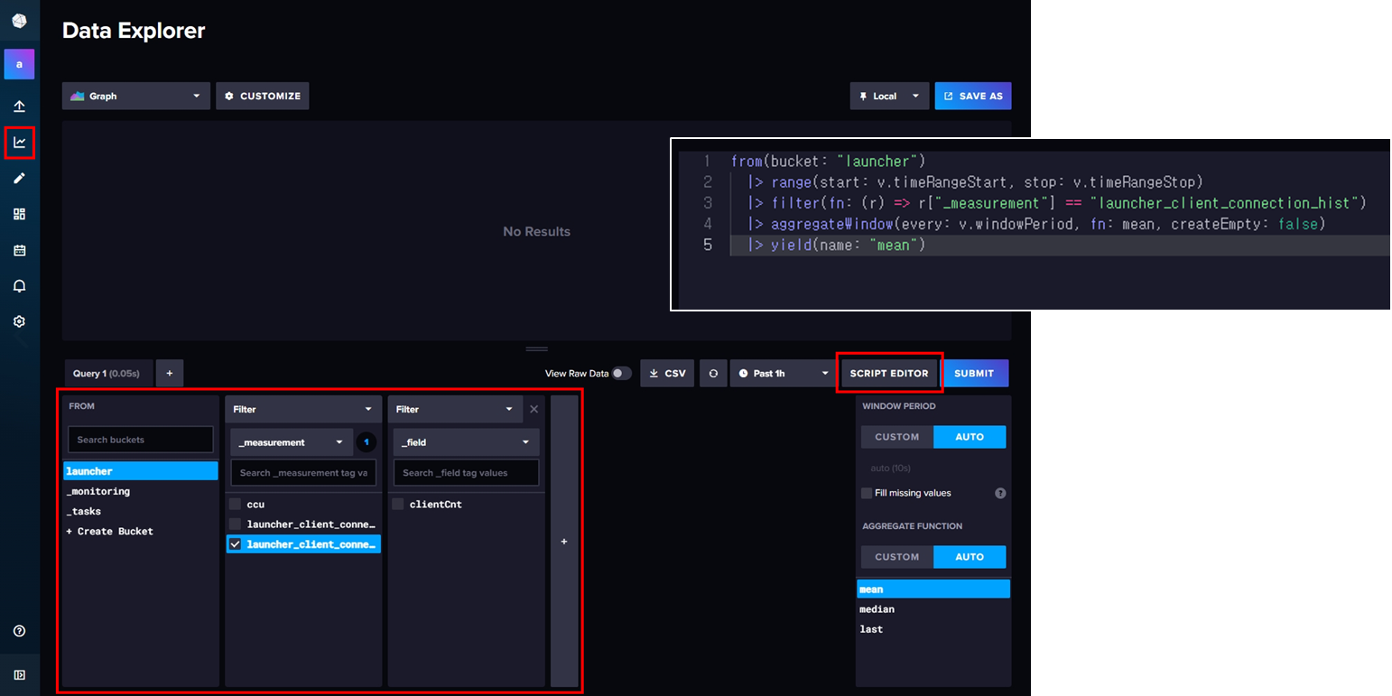 influxDB v2부터 influxql이 없어지면서 flux query를 새로 학습해야 하는 번거로움이 있는데, Data Explorer 하단에는 UI로 손쉽게 데이터를 설정할 수 있습니다.