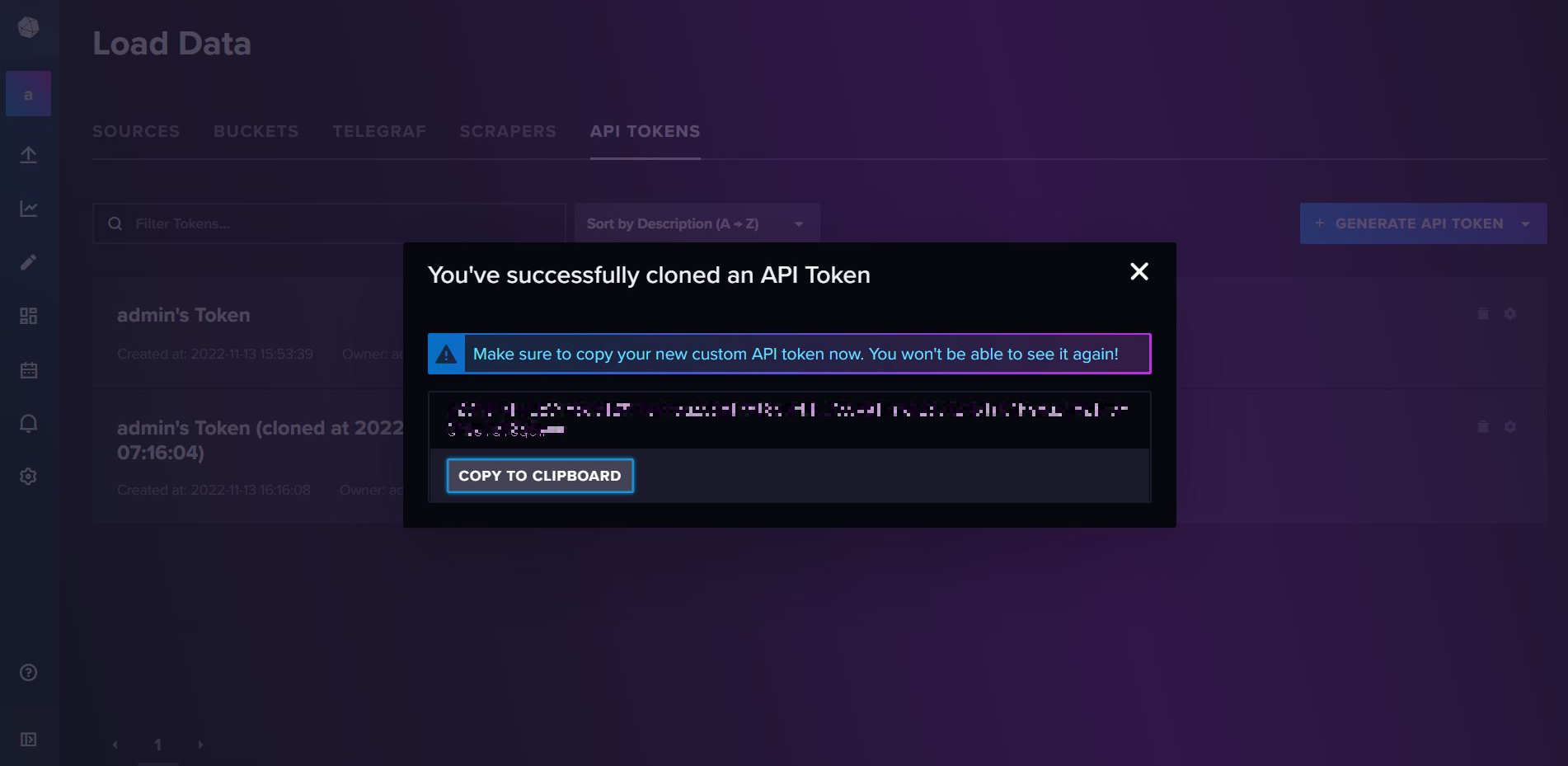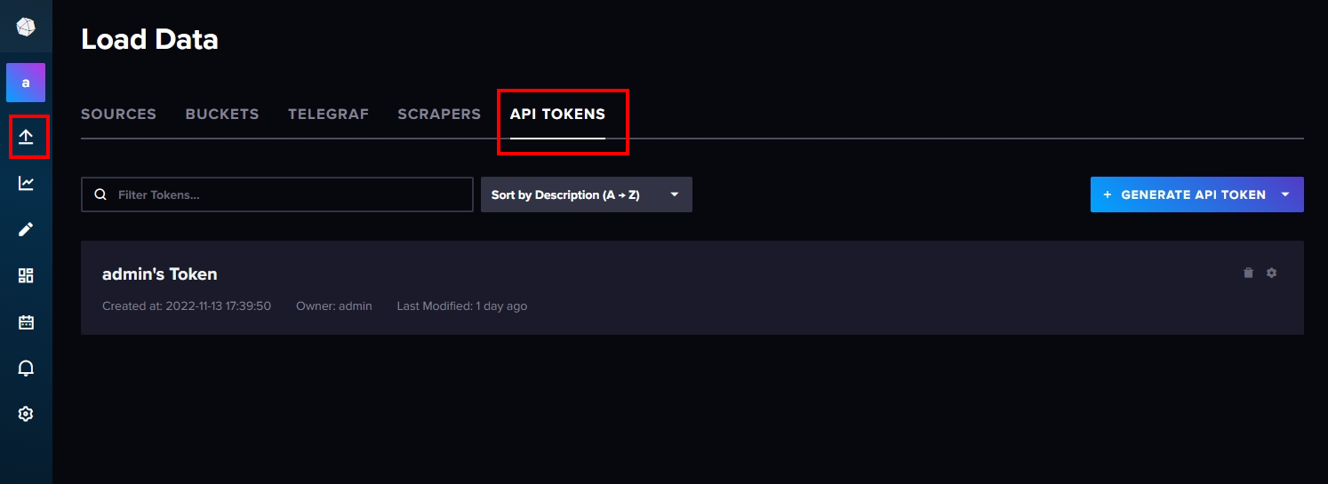 token 발급은 influxdata 문서를 참고하면 되는데, 버전에 따라 조금 다르지만 대개 Load Data > API TOKENS에서 발급받을 수 있습니다.