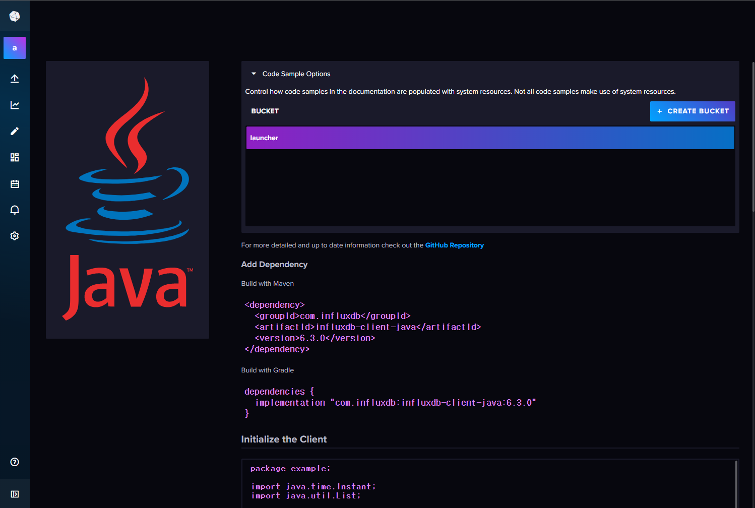 그러면 JAVA를 사용할 경우 추가해야 할 Dependency라던가 Client 설정, 데이터 저장 등의 기본적인 가이드 코드를 제공하는 것을 확인할 수 있습니다.