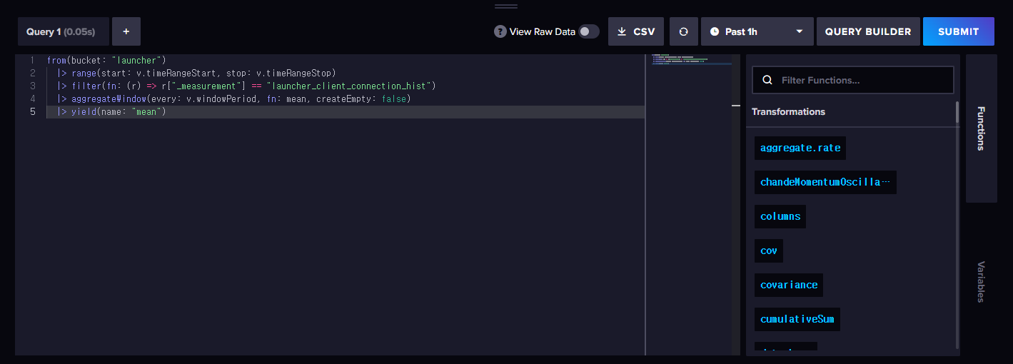 String query = "from(bucket: \"launcher\") |> range(start: -1h)";