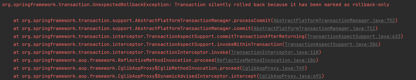 org.springframework.transaction.UnexpectedRollbackException: Transaction silently rolled back because it has been marked as rollback-only