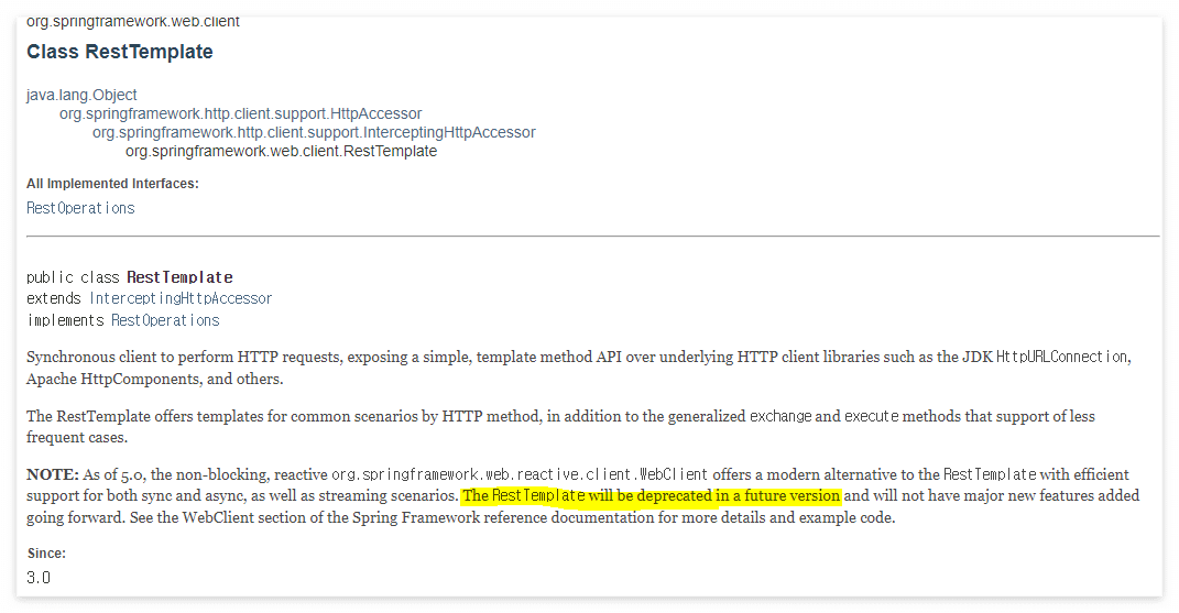 하지만 최근 문서에서는 WebClient 사용을 권고하는 말 뿐, RestTemplate을 Deprecated 한다는 말은 없습니다.