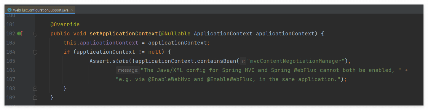그래서 일반적으로 두 가지 의존성이 존재하면 WebApplicationType이 SERVELT이 되므로 WebFluxAutoConfiguration은 활성화되지 않습니다. 만약 @EnableWebFlux 어노테이션으로 강제로 WebFlux를 활성화하더라도 WebFluxConfigurationSupport에서 애플리케이션 실행 시점에 에러를 던져 방지하고 있습니다.