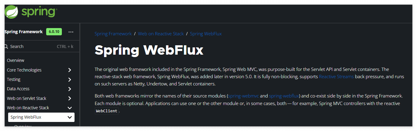 Spring 문서를 확인해보면 "애플리케이션은 하나 또는 다른 모듈을 사용하거나 경우에 따라 두 모듈을 모두 사용할 수 있습니다(예: 반응형 WebClient가 포함된 Spring MVC 컨트롤러)."라고 써져 있습니다.