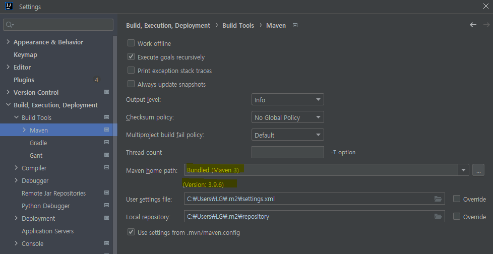 만약 build 실패 중 아래와 같은 에러가 발생한다면, Settings > Build, Execution, Deployment > Build Tools > Maven 에서 Maven home path를 Bundled (Maven 3)로 설정해주시면됩니다.