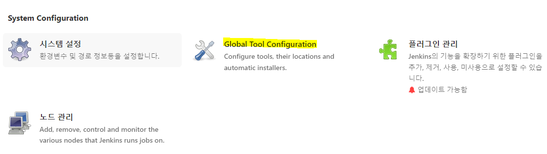 Jenkins 페이지 접속 후 [Jenkins 관리 > Global Tool Configuration]로 이동합니다.