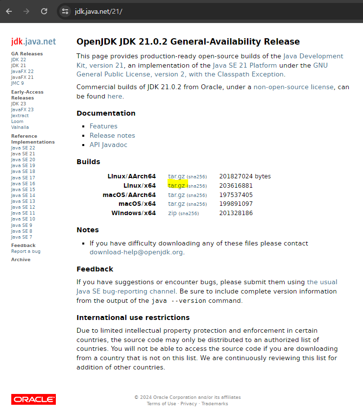 $ wget https://download.java.net/java/GA/jdk21.0.2/f2283984656d49d69e91c558476027ac/13/GPL/openjdk-21.0.2_linux-x64_bin.tar.gz