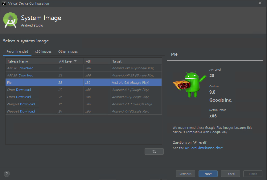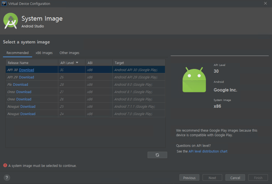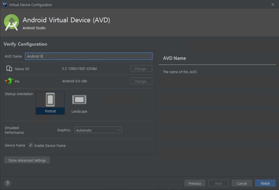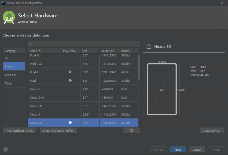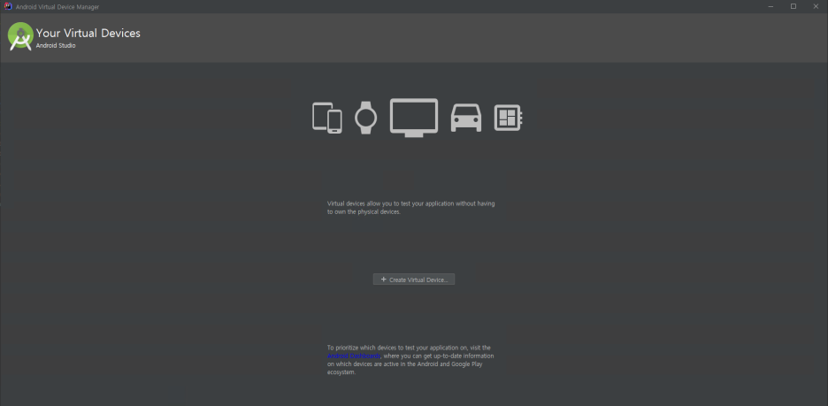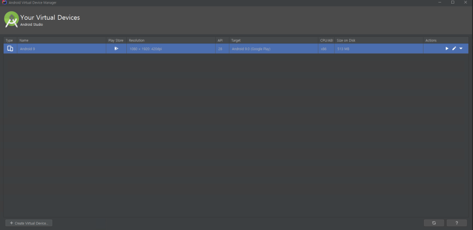 [Create Virtual Device...] 를 클릭하여 device를 생성합니다.