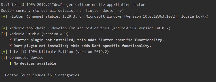 다시 flutter doctor 명령어를 입력해 dependency 파일을 확인합니다.