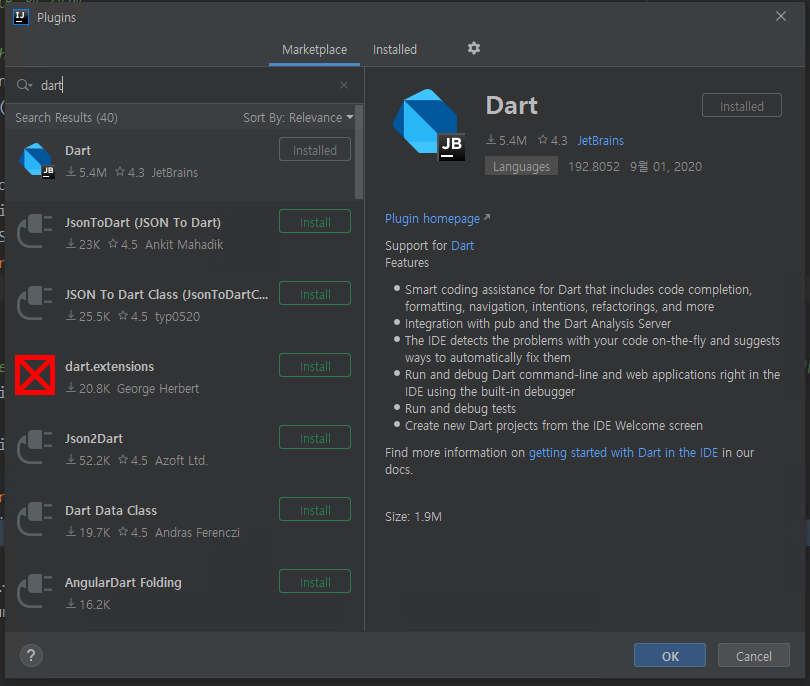 IntelliJ(혹은 android studio)를 실행하여 [File] -> [Settings] -> [Plugins]에서 Flutter와 Dart 플러그인을 설치합니다.