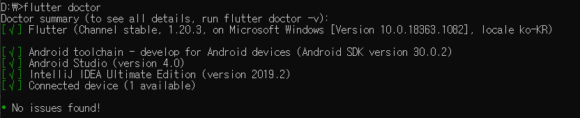 모든 설정이 완료된 후 flutter doctor 명령어를 실행하면 아래와 같은 결과가 출력됩니다.