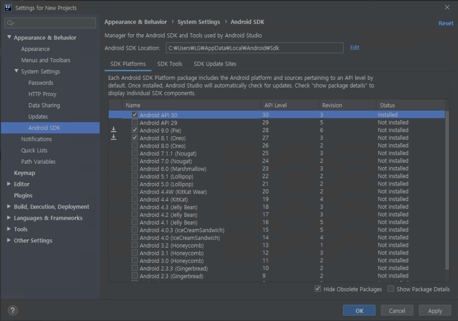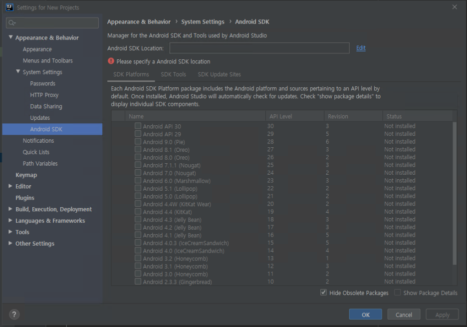 Android SDK Location을 지정해주고 OS를 선택해 설치합니다.