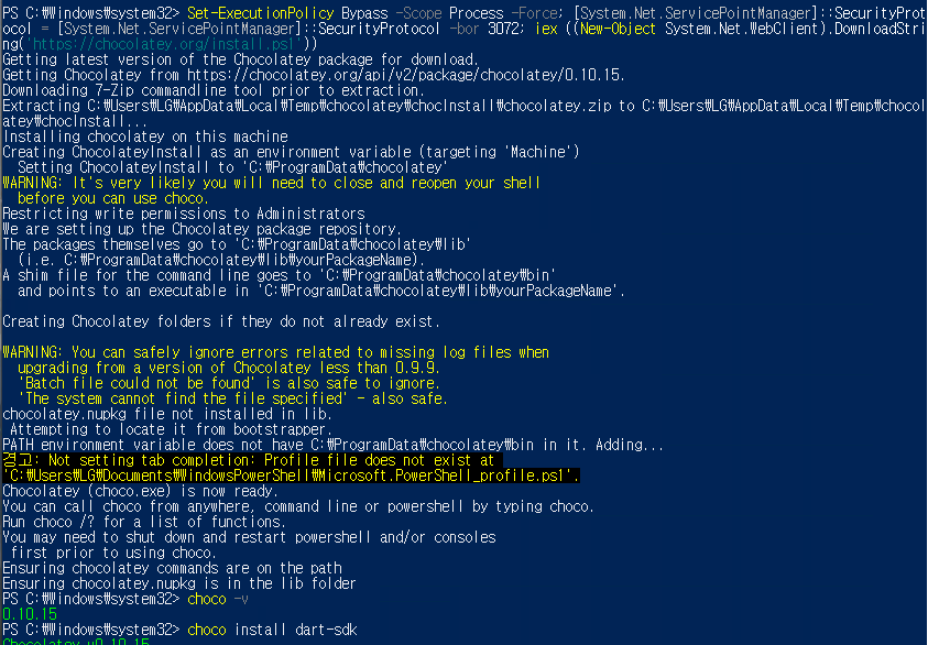 설치 완료 후 choco -v로 설치가 완료되었는지 확인하고 Chocolatey를 사용하여 dart sdk를 설치합니다.