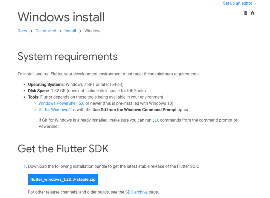 https://flutter.dev/docs/get-started/install에 접속하여 맞는 sdk 파일을 다운로드합니다.