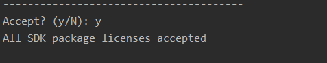 Command 창에 아래 명령어를 입력하여 안드로이드 라이선스 동의를 합니다.