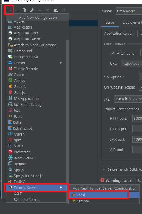 5. 팝업창이 뜨면 상단좌측의 + > Tomcat Server > Local을 클릭합니다.