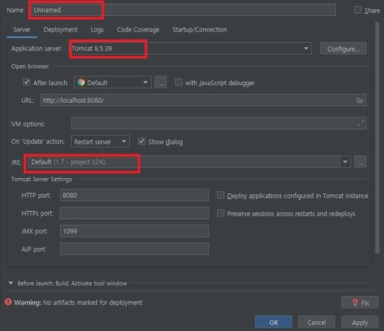 6. 서버 Name 및 Local의 Tomcat 위치, JRE를 설정합니다.