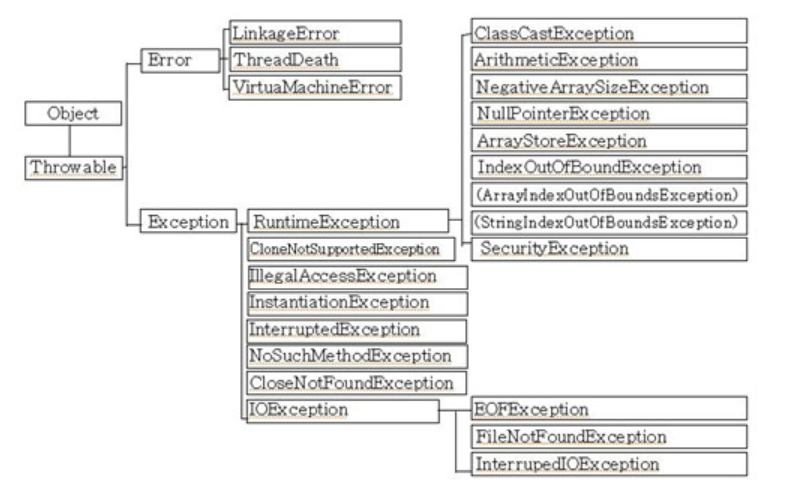 - 예외(exception) : 프로그램 코드에 의해서 수습될 수 있는 다소 미약한 오류 (처리 가능한 오류)