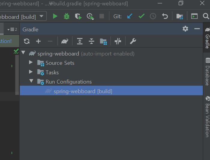 그리고서 인텔리제이 우측에 Gradle 탭을 클릭하 뒤,Run Configurations > spring-webboard를 클릭하면 war로 빌드됩니다.