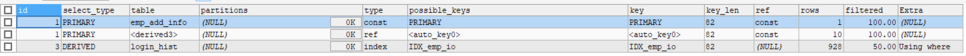 - DERIVED : select문으로 추출된 테이블 ( from 절에서의 서브쿼리 또는 inline view)