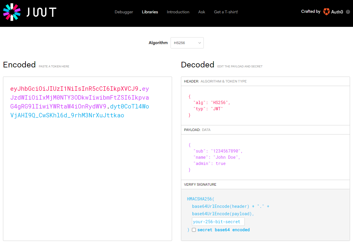 jwt.io 디버거를 사용하여 JWT를 인코딩, 디코딩할 수 있습니다.