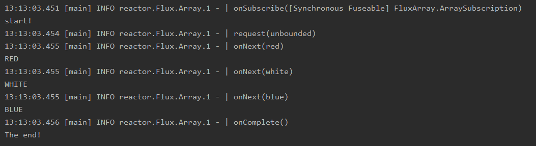 Flux<String> colorFlux = Flux.just("red", "white", "blue")