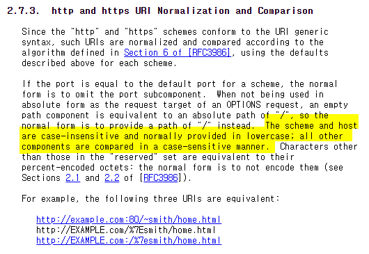해석하면, 스키마(http/https)와 호스트는 대소문자를 구분하지 않으며 일반적으로 소문자로 제공됩니다. 다른 모든 구성 요소(URI 등)는 대소문자를 구분하는 방식으로 비교됩니다.