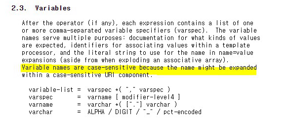 Variable은 paramter의 대소문자 허용 유무에 따라 구분 여부가 결정되지만, RFC-6570을 보면 대소문자 구분하는 것을 권장하고 있습니다.