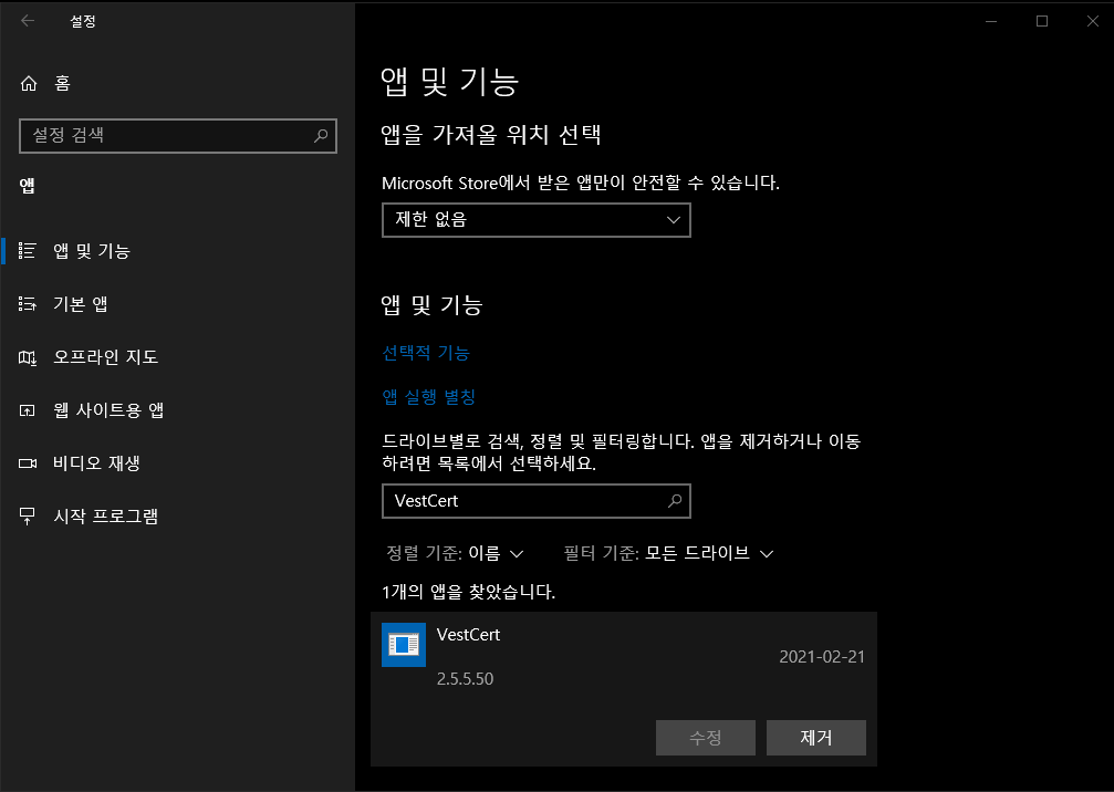 앱 및 기능에서 "VestCert"를 검색하여 제거합니다.