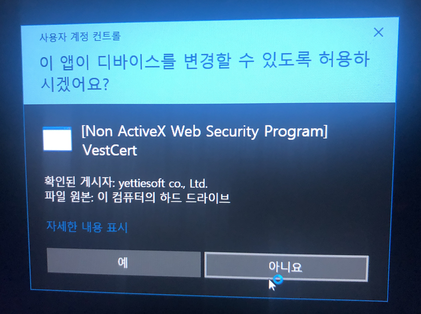 어느 순간 컴퓨터를 부팅하면 [Non ActiveX Web Security Program] VestCert 앱이 디바이스를 변경할 수 있도록 허용하시겠어요?라는 알림 창이 뜨기 시작했습니다.