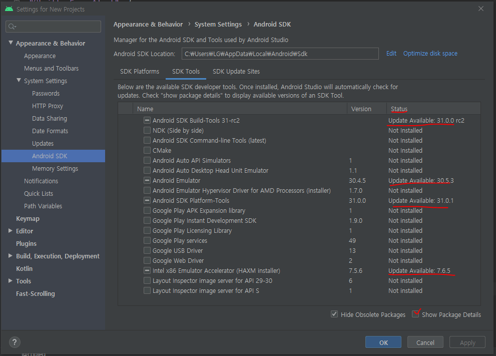 (참고. Android SDK Build-Tools 31-rc1이 Updates Available 상태이면 Show Package Details를 체크하여 맨 위의 항목을 선택)