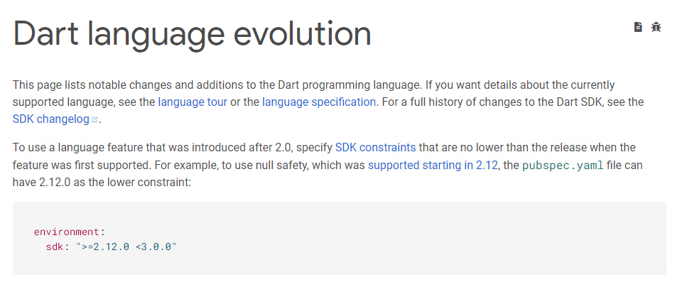 pubspec.yaml의 environment:sdk: 버전은 https://dart.dev/guides/language/evolution 에서 최신 버전을 확인 할 수 있습니다.