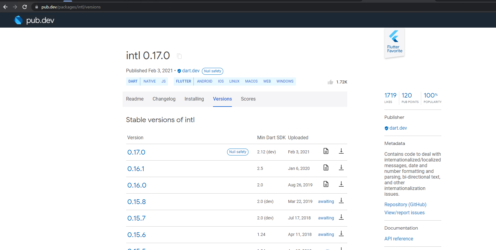 dependency 패키지의 버전은 https://pub.dev/에서 검색하여 최신버전을 확인할 수 있습니다.